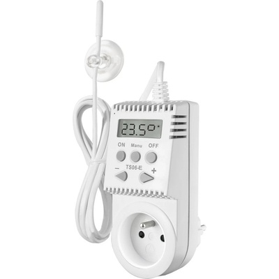 Vlastnosti tepelně spínané zásuvky TS06-E: Rychlé nastavení požadované teploty tlačítky + a - . Výhody tepelně spínané zásuvky TS06-E: externí čidlo délky 1.6 m, možné použít i do vody max. teplota 70°C jednoduché ovládání funkce trvalého vypnutí spotřebiče (OFF)...