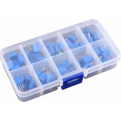 Sada potenciometrických víceotáčkových trimrů typu 3296W. Hodnoty v sadě: 500R, 1K, 2K, 5k, 10K, 20k, 50k, 100k, 200k, 1M - 5ks každý, celkem 50ks Součástí dodávky: 1ks...