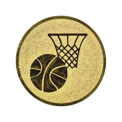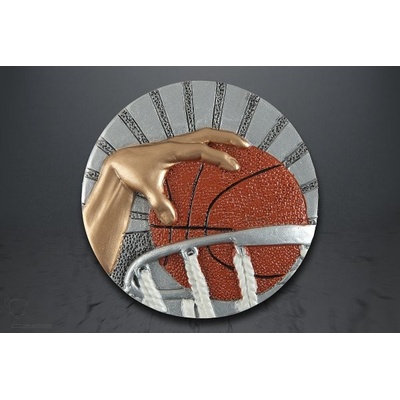 Kovový emblém s motivem basketbalu.