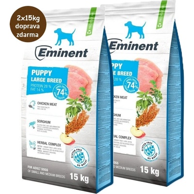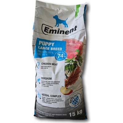 Eminent Dog Puppy Large 15kg INOVOVANÁ RECEPTURA (2023). Kompletní bezlepkové krmivo s příchutí kuřecího masa poskytuje štěňatům, březím a kojícím fenkám velkých a obřích plemen (> 25 kg) potřebné živiny pro správný růst, vývoj a energii štěněte. Optimální hladina...