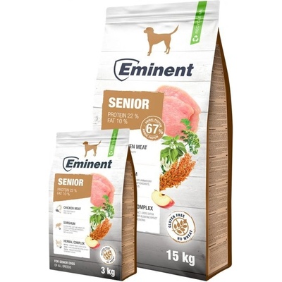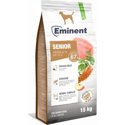 Eminent Dog Senior & Light 15 kg Kompletní bezlepkové krmivo pro starší psy všech plemen. Psi v pozdějším věku mají citlivější organismus. Snížená hladina bílkovin a tuků společně s čirokem a rýží usnadňuje stravitelnost. Mannanoligosacharidy (MOS) podporují činnost...