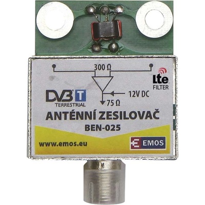 Anténní předzesilovač 25dB VHF/UHF, Emos Popis: BEN-025 předzesilovač je určen pro montáž do anténní krabičky se zesílením 25 dB. Zesilovač je v kovovém krytu čímž odrušuje vnější vlivy a je zakončen konektorem F. Pracuje v pásmu BIII, IV, V a má certifikaci CE. Rozteč...