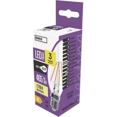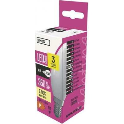 Emos LED žárovka CANDLE, 4W/30W E14, WW teplá bílá, 330 lm, Classic A+ technologie LED patice (uchycení žárovky) E14 kategorie/řada CLASSIC barva světla teplá bílá příkon 4 W náhrada za žárovku 30 W světelný tok/svítivost 330 lm světelná účinnost 83 lm/W teplota...