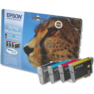 Epson T0715 CMYK; Značková náplň pro vaši inkoustovou tiskárnu Epson zajistí maximální kvalitu tisku. ZÁKLADNÍ SPECIFIKACE; Pro tiskárny: Epson Stylus D78, D92, D120, DX4000 DX4400, DX5000, DX6000, DX7000F, DX7400, DX8400, DX9400F, S20, S21, SX100, SX...