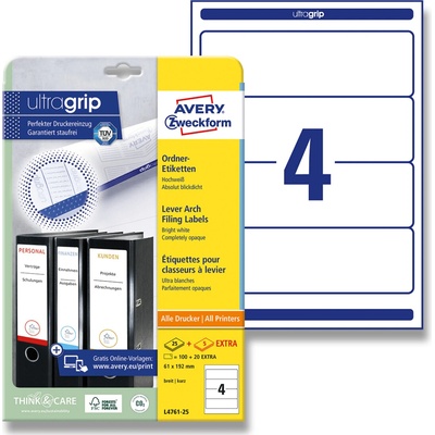 Univerzální etikety v bílé barvě. Inovativní technologie ultragrip na zadní straně archu zajišťuje bezchybné natažení archu etiket a tisk bez zasekávání etiket v tiskárně....