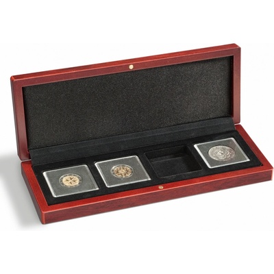 Vysoce kvalitní mincovní etue VOLTERRA v mahagonové barvě dřeva pro uložení 3 kapslí na mince QUADRUM 50 x 50 mm. Polstr víka čalouněný černým saténem vč. saténové stuhy pro...