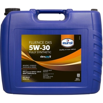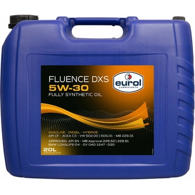 Olej motorový, plně syntetický, balení 60 litrů, specifikace: SAE 5W-30, VW 502.00/VW 505.01/VW 505.00, BMW Longlife-04, MB 229.51, MB 229.52, MB 229.31, GM dexos 2, ACEA C3, API SN/CF, GM-LL-A-025, GM-LL-B-025, Fiat 9.55535-S3 ## Motorový olej Eurol Fluence DXS...