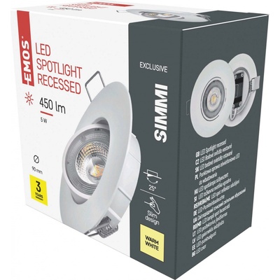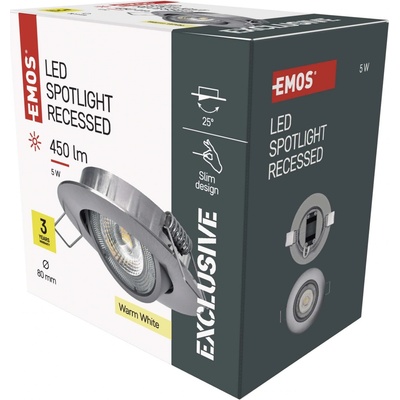 Emos ZD3121 LED bodové svítidlo 5W Exclusive teplá bílá LED svítidlo je určeno k montáži na pevný podklad do vnitřních prostor, např. na zeď, strop apod. Krytí IP20 – pro vnitřní prostředí. Parametry produktu typ svítidla vestavné zdroj světla LED příkon 5...