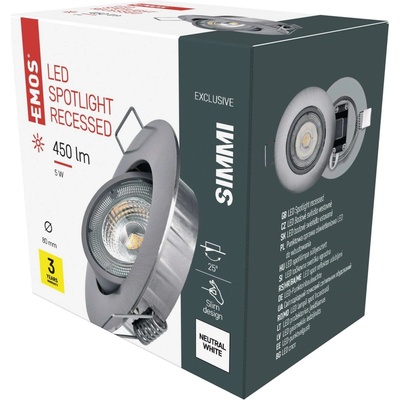 Emos ZD3121 LED bodové svítidlo 5W Exclusive neutrální bílá LED svítidlo je určeno k montáži na pevný podklad do vnitřních prostor, např. na zeď, strop apod. Krytí IP20 – pro vnitřní prostředí. Parametry produktu typ svítidla vestavné zdroj světla LED příkon 5...
