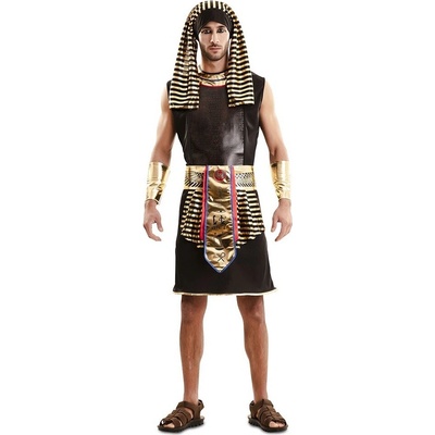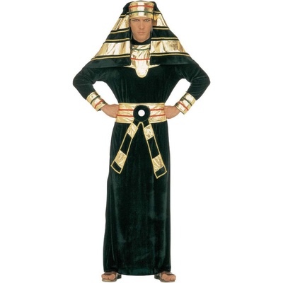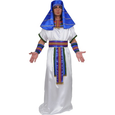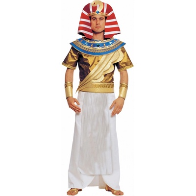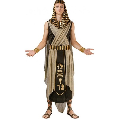 Dobový krásně zdobený kostým faraona. Kostým obsahuje halenu se zlatým límcem, kalhoty s ozdobným pásem, pokrývku hlavy, ale návleky na boty ne.