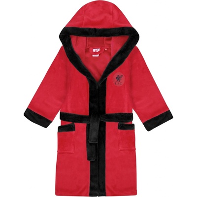 Dětský župan Liverpool FC v červené barvě. Je doplněn kontrastním páskem, lemem a manžetami ve černé barvě. Na levé straně je černý znak mytického Liverbird. Materiál z...