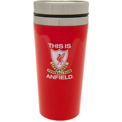 Luxusní cestovní hrnek Liverpool FC v červené barvě. Vyroben z kvalitního hliníkového jádra a plastu s objemem 450 ml. Uprostřed vyniká barevný znak klubu a bílý nápis This is...