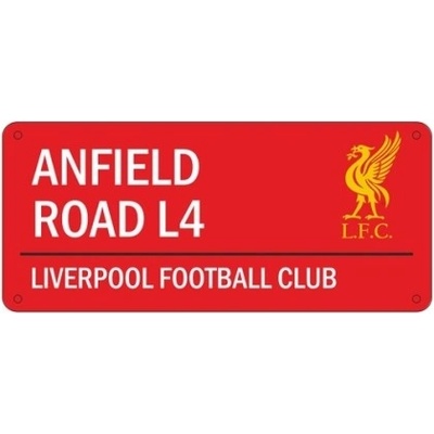 Plechová cedule Liverpool FC. Vyrobené z odolné lisované oceli. Ideální do každého pokoje. Rozměr: 40 x 18 cm.