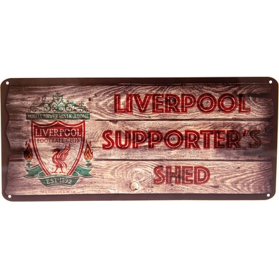 Plechová cedule Liverpool FC. S velkým klubovým znakem a nápisem "Supporter's shed" na pozadí s efektem dřevěného panelu. Rozměr: 40 x 18 cm.