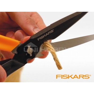 Víceúčelové nůžky Fiskars Cuts&More jsou ideální pro střihání různých materiálů používaných doma a na zahradě, jako jsou obaly od potravin, krabice od nápojů, různé plasty apod. Pohodlná ergonomická držadla. Střihač drátů. Nůž na provázky. Otvírák na láhve. Řezač na...