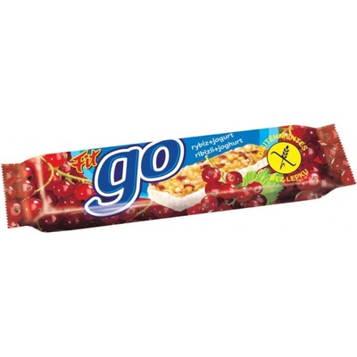 Fit Go rybíz a jogurt 23 g. Plochá lisovaná tyčinka, velikostně vyrovnaná se zrnitou mozaikou s chutí rybízu, výrobek obsahující cereálie a sušené ovoce, politá na spodní straně a částečně na bočních stranách polevou s jogurtovou příchutí. Složení: Škrobový sirup,...