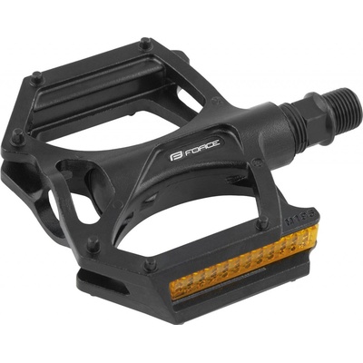 Pedály BMX Force Alu + odrazky černé kuličková ložiska, s odrazkami protiskluzová úprava s piny materiál: tělo pedálu Al hliník, osa Cr-Mo velikost platformy: 100x100x27 mm nevyměnitelné piny hmotnost 1 páru: 335 g