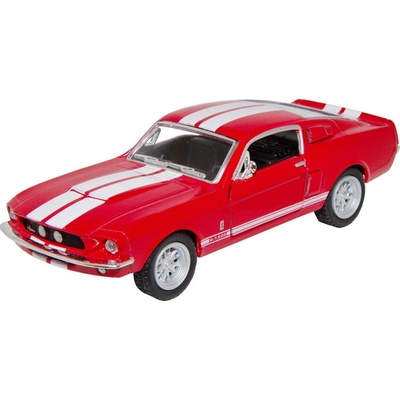 Ford Mustang Shelby GT-500 (1967) 1:38 - červený. Auto má kovovou karoserii, gumová kola, otevírací dveře a plastový interiér. Auto má zpětné natahování pro pohyb vpřed.