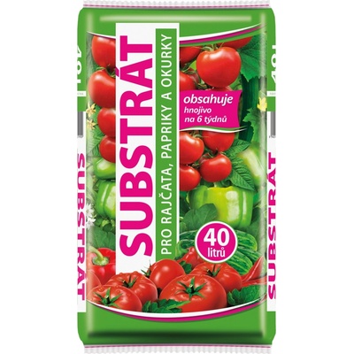 Substrát pro rajčata, papriky a okurky 40L je vyroben ze směsi vytříděné světlé a tmavé rašeliny, kvalitního vytříděného zeleného kompostu, lávy a organických hnojiv obsahujících všechny hlavní živiny i stopové prvky. Substrát neobsahuje minerální (průmyslová) hnojiva....