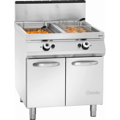 Plynová fritéza 800x900x900 mm, Bartscher 2959521 vyrobena z oceli. Má 2 komory o kapacitě 20 litrů každá, odtokový kohoutek na tuk, nádobu na tuk, a také stabilní nožky s...