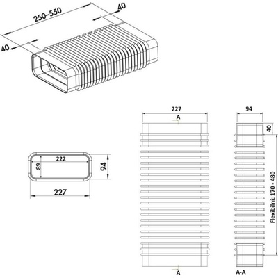 Flexibilní potrubí je vyztuženo spirálovým rámem z ocelového drátu. Obsahuje oboustrannou přípojku na ploché potrubí. Je určeno pro ohyb až do 90°. Délka je 250-550 mm.