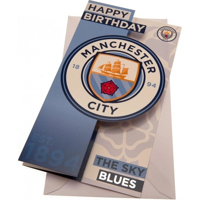Barevné rozkládací narozeninové přání Manchester City s lesklým povrchem. S velkým vystřiženým klubovým znakem. Uvnitř vzkaz a místo pro přání. Včetně bílé obálky. Rozměr: 22 x 12 cm.