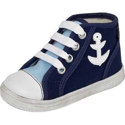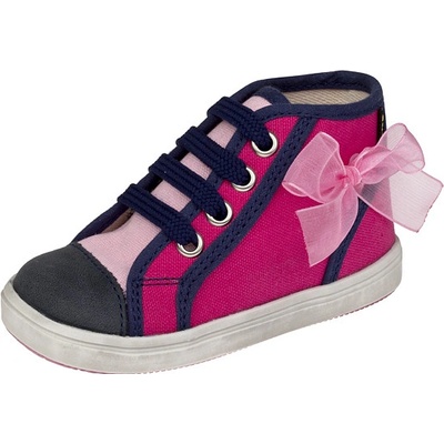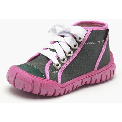 Krásné dětské tenisky pro malé parádníky Lehká, kotníčková obuv, šněrovací, maximálně ohebná a prodyšná. Svršek obuvi je z bavlněného, olemovaného textilu v kombinaci s hladkou kůží na špici. Předností je vyjímatelná vkládací stélka, pevný opatek i špice a podešev z...