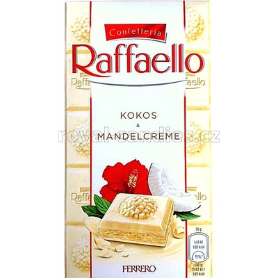 Raffaello bílá čokoláda 90g V letních měsících upozorňujeme na riziko roztečení čokoládových výrobků během přepravy. Zvažte prosím toto riziko během svého nákupu. Kokosový sen! S lahodnou čokoládou Raffaello můžete zažít oblíbené kokosové pralinky ve zcela nové podobě....