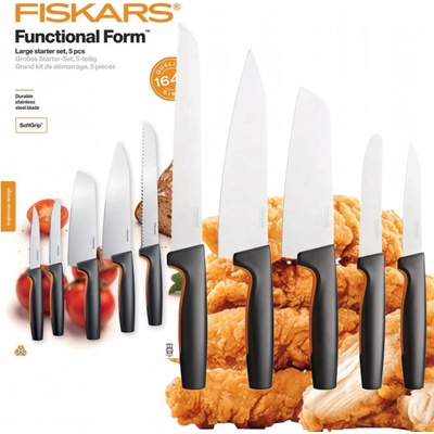 Sada 5 nožů Fiskars Functional Form Startovací sada Fiskars Functional Form obsahuje pět základních typů nožů vyrobených z vysoce kvalitní japonské nerezové oceli – víceúčelový okrajovací nůž, univerzální nůž Santoku asijského typu, snídaňový nůž s vroubkovaným ostřím,...