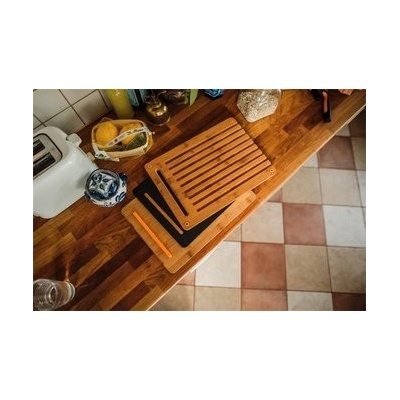 Sada 3 řezacích desek. - Obsah: 1 drážkovaná deska (v drážkách se zachytávají strouhanky a protiskluzové silikonové nožičky ji připevňují k povrchu) 1 plochá krájecí deska...