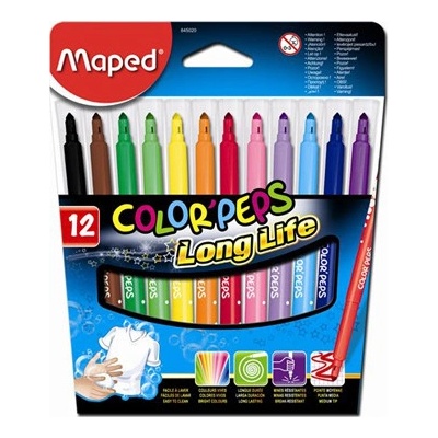 PŘEDNOSTI barevných fixů Maped ColorPeps, * BEZPEČNOST - prodyšný uzávěr, * ODOLNOST - hrot odolný proti zatlačení, poškození či vysychání, * VYPRATELNÉ - inkoust vypratelný z...