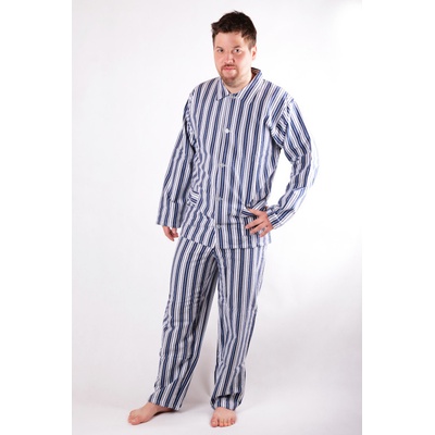 Stylové pánské pyžamo z hřejivého flanelu v tmavě modré barvě s bílým proužkem. Klasický střih s pohodlným zapínáním a kapsou na kabátku.