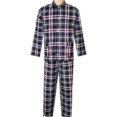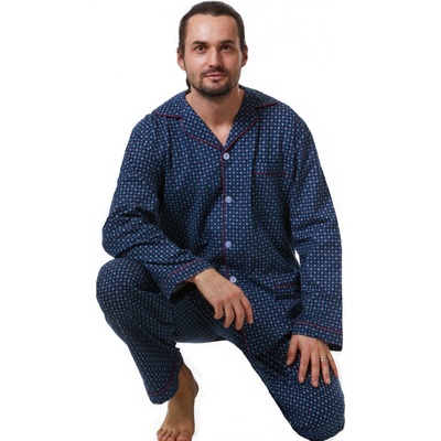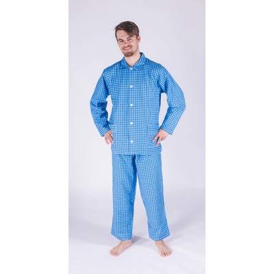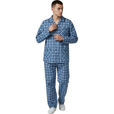 Pánské dlouhé pyžamo z flanelu ze 100% bavlny. Kabátek je celopropínací na knoflíky a se dvěma bočními kapsami. Kalhoty jsou volné s vyměnitelnou gumou. Ilustrační fotografie...