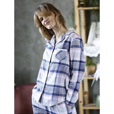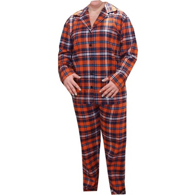Teplé flanelové pyžamo dámské, s károvaným vzorem. Vrchní díl je s límečkem, vepředu na rozepínání, na hrudi je kapsa. Dlouhé kalhoty jsou v pase do gumy, na bocích kapsy.