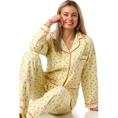 Dámské žluté pyžamo z flanelu s modrým květinovým vzorem. Měkké, hřejivé, jemné k pokožce, vyrobené ze 100% bavlny.