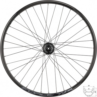 26" zapletené kolo přední přední náboj SH HBM3050 pro kotoučovou brzdu Center lock 36 děr, jednoduchý nýt, včetně rychloupínáku otvor pro ventilek: 8,5 mm výška ráfku: 20 mm materiál ráfku: Al hliník, černý elox materiál drátů: nerez, černé maximální váha jezdce: 130...