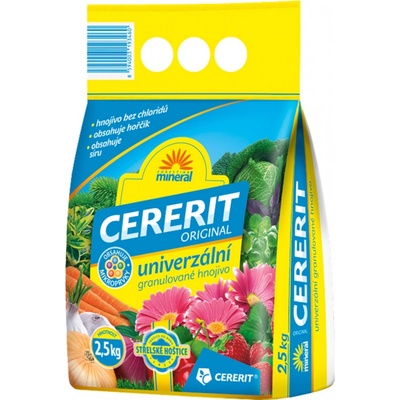 MINERAL Cererit je bezchloridové granulováné hnojivo obsahující stopové prvky k výživě zeleniny, ovoce a okrasných rostlin. Ideální pro rostliny citlivé na chlór (plodová zelenina, květiny). Díky hořčíku je vyšší úroda a lepší vybarvení plodů. Dávkování: 2/3 dávky...
