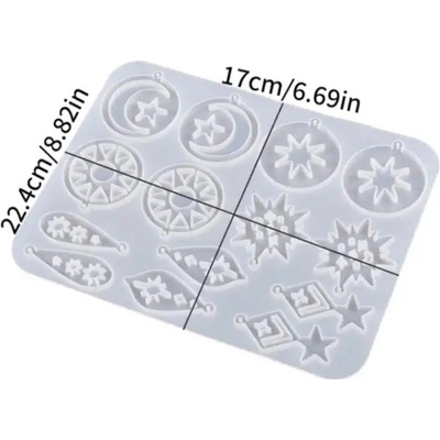 Silikonová forma na výrobu šperků z pryskyřice. Silikonová forma je pružná, výrobek lze po vytvrzení pryskyřice snadno vyloupnout. Specifikace:Rozměr: 170x224Upevnění: jednotlivé tvary jsou opatřeny otvory - upevnění kovovým očkem Materiál: silikon