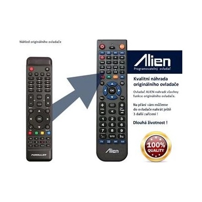 Dálkový ovladač Formuler F4 Turbo Kvalitní náhradní dálkové ovládání jiného vzhledu pro Satelitní příjímač Formuler. Pod značkou ALIEN získáte kvalitní a levnou náhradu...
