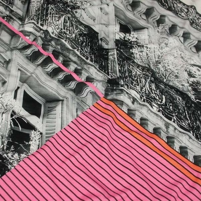 Barevný viskózový úplet, motiv vínovo-růžové pruhy a černobílá fotografie domu. Složení látky 94%viskóza, 6%elastan. Šířka pleteniny 140 cm. Metráž je splývavá a příjemná na...