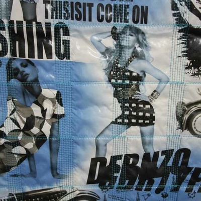 Moderní foto prošev se vzorem aut a dívek v barevném provedení bílá,modrá, černá. Zadní strana této prošívané látky je černá. Prošev má složení 100% polyester.