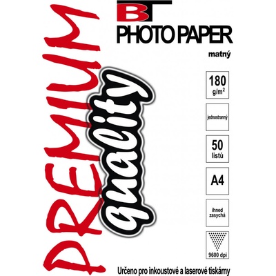 Premium BT photo papír A4 Vysoce kvalitní oboustranný fotopapír A4 180g2 matný - balení 50ks Papír umožňuje tisk i do vysokého rozlišení - až 9600dpi Inkoust na něm...
