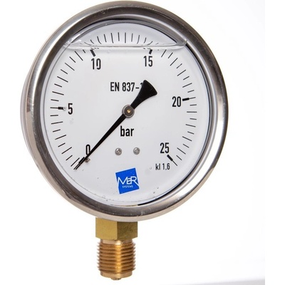 manometr - tlakoměr , průměr 63mm, zadní přípoj, tř. 1,6%, pouzdro nerez, ústrojí mosaz, glycerin