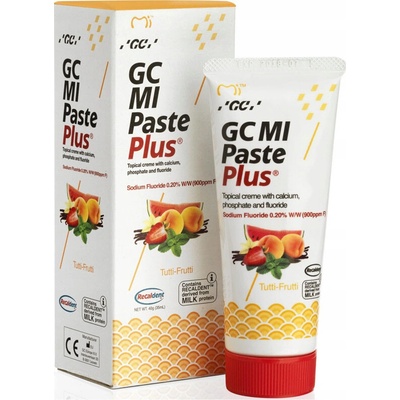GC MI Paste Plus Tutti-Frutti 35 ml Dentální krém GC MI Paste Plus Meloun s volně dostupným vápníkem, fosfátem a fluoridy, v poměru 5:3:1, je určen pro pacienty postižené ztrátou zubní tkáně, agresivním zubním kazem či zvýšenou abrazí zubů.