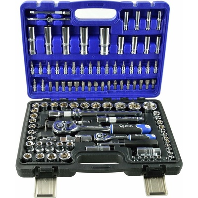 Praktická 108dílná gola sada GEKO je vhodná pro domácí i profesionální využití. Obsahuje širokou škálu nástrčných hlavic a bitů, dvě ráčny s prodloužením a další nářadí.