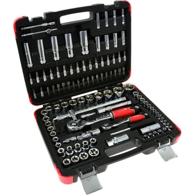 Gola sada složená ze 108 dílů. Sada obsahuje 2 ráčny, ořechy, bity a další díly s nejpoužívanějšími rozměry 1/2" a 1/4". Nářadí je vyrobeno z Cr-V a je uloženo v plastovém kurfu. Celou sadu tak můžete snadno přenést. Vlastnosti: - Sada nástrčných klíčů 1/4" a 1/2" -...