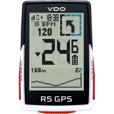 VDO počítadlo R5 GPS Full Set Velmi velký displej, snadné ovládání a více než 34 funkcí: počítač z řady VDO R spolehlivě zobrazuje cyklistům všechny důležité údaje o tréninku...