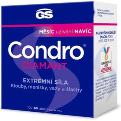 GS Condro DIAMANT představuje mimořádnou sílou pro vaše klouby s měsícem užívání navíc. Nejvyšší množství glukosamin sulfátu Clini-Q, unikátní DIAMANT FORTESCIN® s vitaminem C, který přispívá k podpo