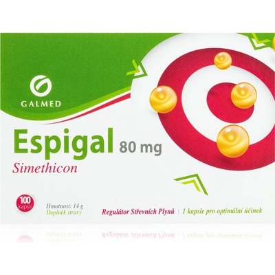 Espigal 80 mg, Simethicon, Regulátor Střevních plynů, 1 kapsle pro optimální účinek. Doporučené dávkování 3x denně jedna kapsle během jídla nebo po jídle, podle potřeby i na noc. Upozornění Není určeno pro děti do 6 let. Nepřekračujte doporučené denní dávkování....