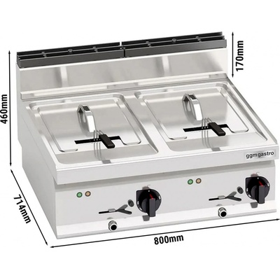 Fritéza dvojitá plynová 2x8 l vyrobená z nerezové oceli, třífázová. Rozměr vany v cm: 2x 15x35x36, 2x koš, rozměr koše v cm: 12x30x15, s víkem. Produkce 12 kg/hod. Vhodná do...
